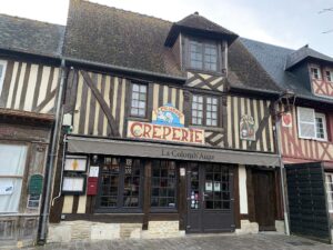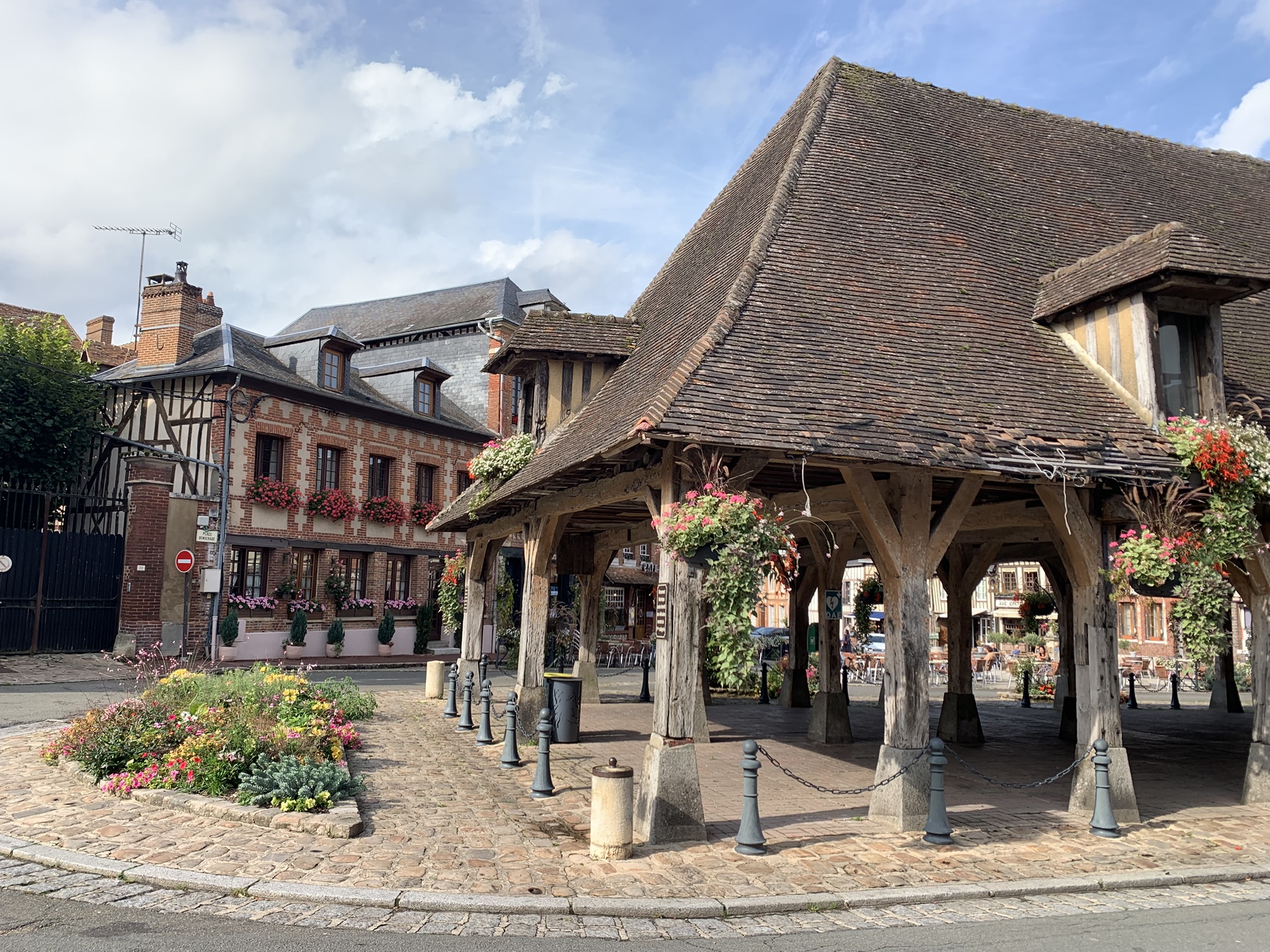 La place centrale, avec ses halles du XVIIIe siècle en chêne, est encadrée de maisons à colombages aux couleurs chatoyantes.